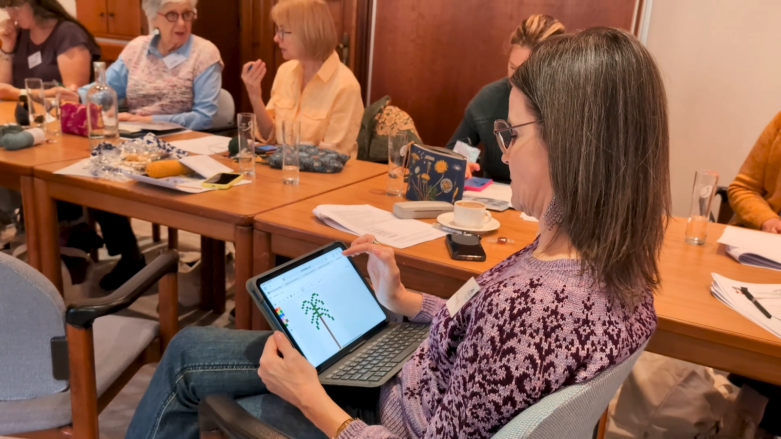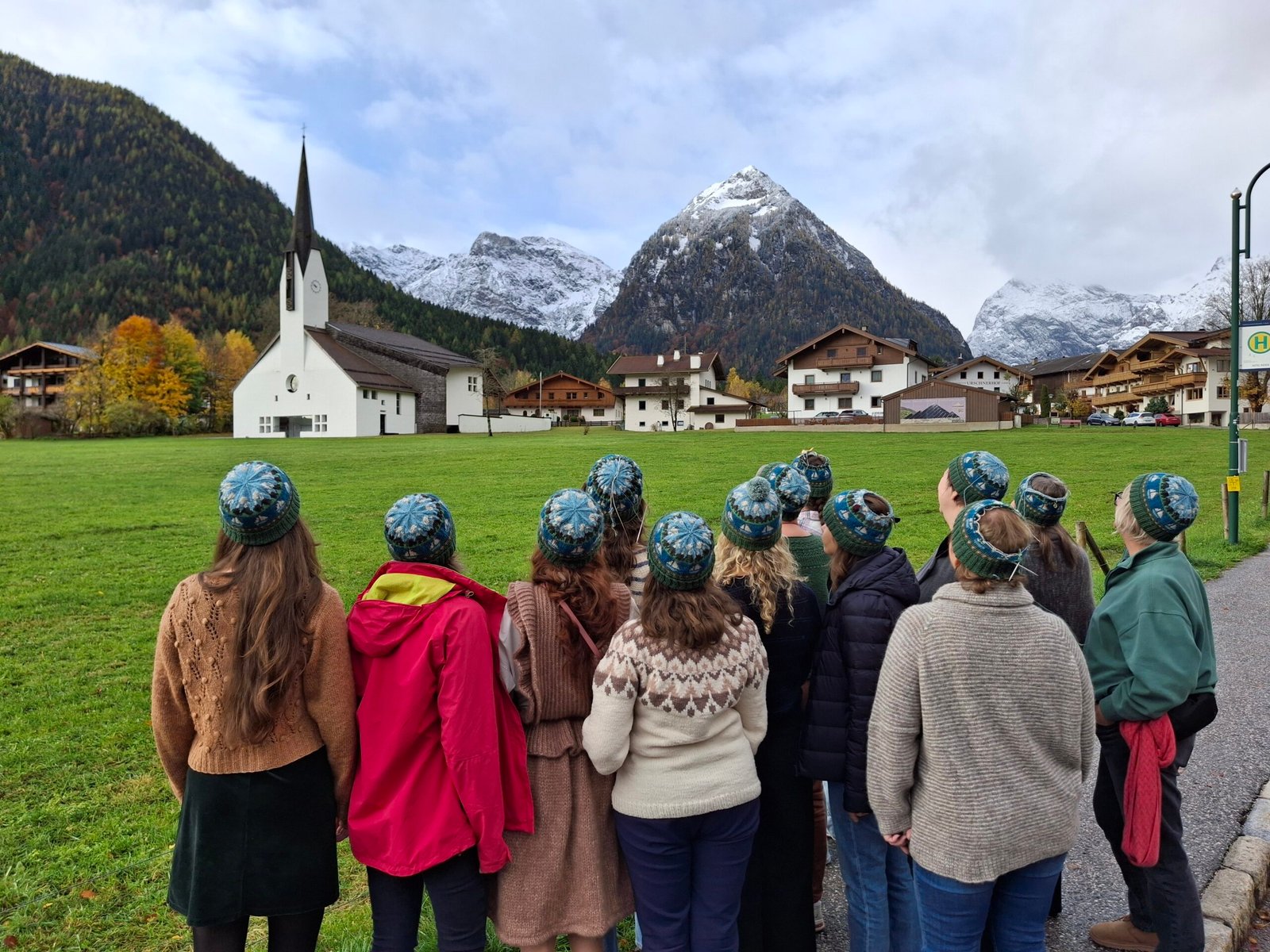Charlotte’s workshops were like a masterclass in knitting colourwork socks covering everything from choosing yarns and colours, to measuring your feet for the perfect fit, reading colourwork charts, managing floats, and working stranded colourwork across different knitting styles. After that, we learned to design our very own stranded colourwork motifs. Charlotte shared her clever formula for creating motifs that can easily be adjusted to different sizes. Many knitters even managed to finish or almost finish their special Austrian Alps Colourwork Hats designed by Charlotte exclusively for this retreat. We made sure to pose together for a group photo!