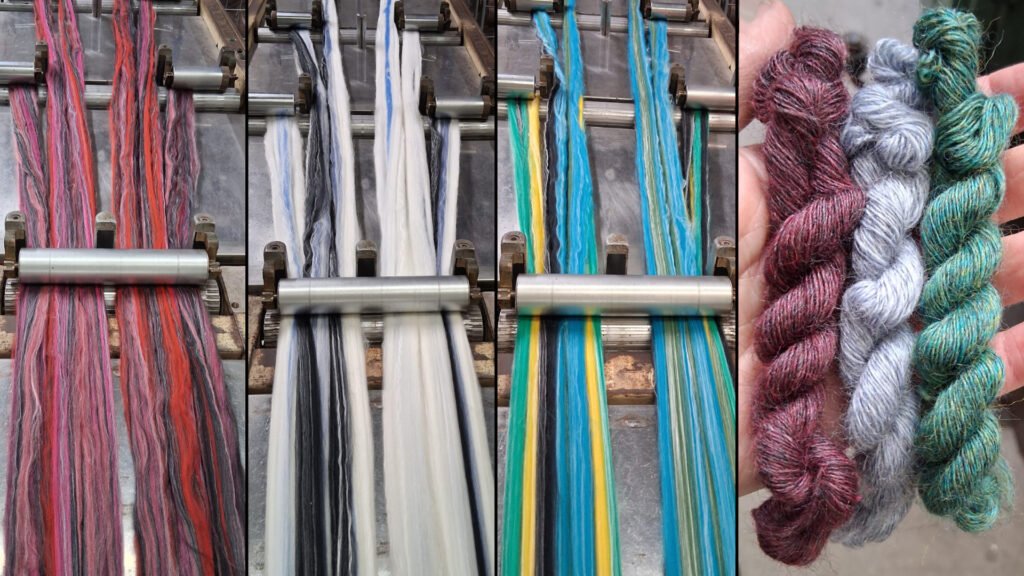 Last episode we shared how I spent a full day and a half at the John Arbon Textiles spinning mill in Devon UK coming up with new colourways for our yarn range together with the mill folk. We would weigh tiny percentages of different coloured fibres before carding and hand-twisting them into little “yarn” samples. The goal was to get as close to my desired colours before doing an actual test spin on their machines, as the latter is both expensive and time-consuming.