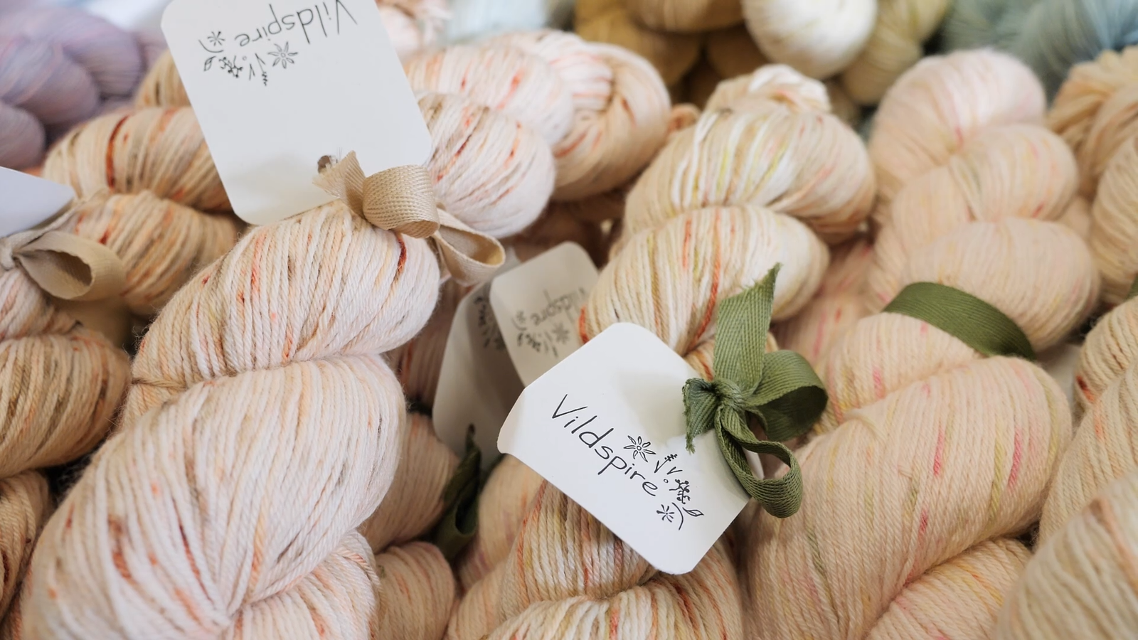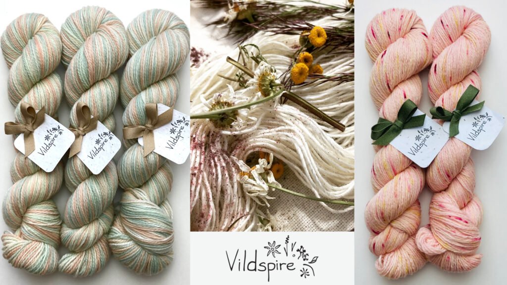 Cecilie, the natural hand-dyer behind Vildspire, is from Denmark and has a background in ladies’ tailoring and clothing design. After her children were born, she grew interested in intuitive hand-dyeing with natural ingredients. Unlike most dyers, she doesn’t just create solid colours but has developed a method to create speckles using natural dyes. In the interview, Cecilie explains this method and shows us some of her yarn bases and beautiful colourways.