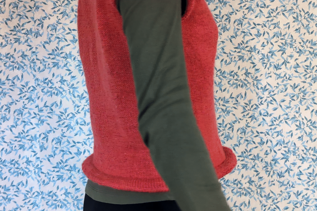 To stay positive, she moved on to the sleeves and came back to the hem, once everything else was completed and she felt like she had accomplished something. Now, her Elizabeth Top is completed and looks much improved with the original 1×1 rib! 😉
