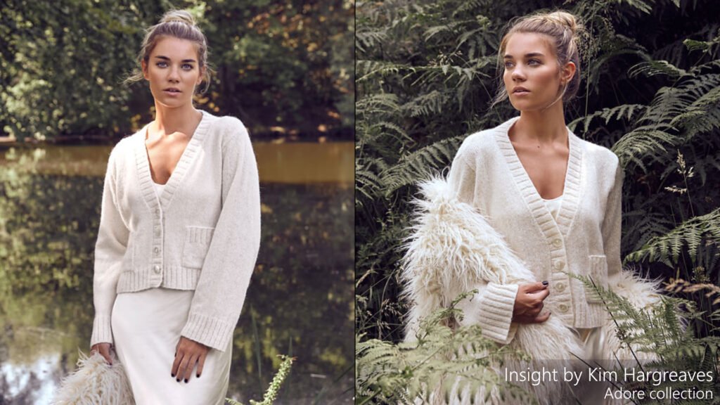 I wanted a simple, grandpa-style cardigan in our own yarn, and our sport weight knits up beautifully at about 23–24 stitches per 10 cm. This works well with Insight by Kim Hargreaves, from her book Adore.