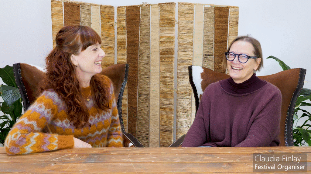 Andrea is wearing her Nightingale by Norah Gaughan on the couch and her Instant Crush by Joji Locatelli during the interview with Claudia Finlay from Munich Knits. Madeleine is wearing her Elizabeth Blouse by PetiteKnit on the couch and her Laya by Kim Hargreaves and her Do Ewe Yoke Sweater by Zanete Knits during the Munich Knits vendor interviews.