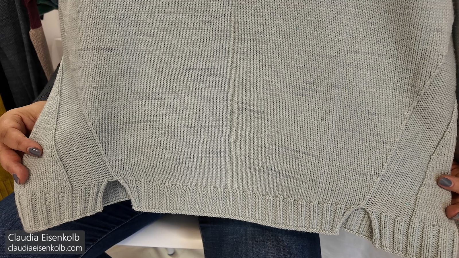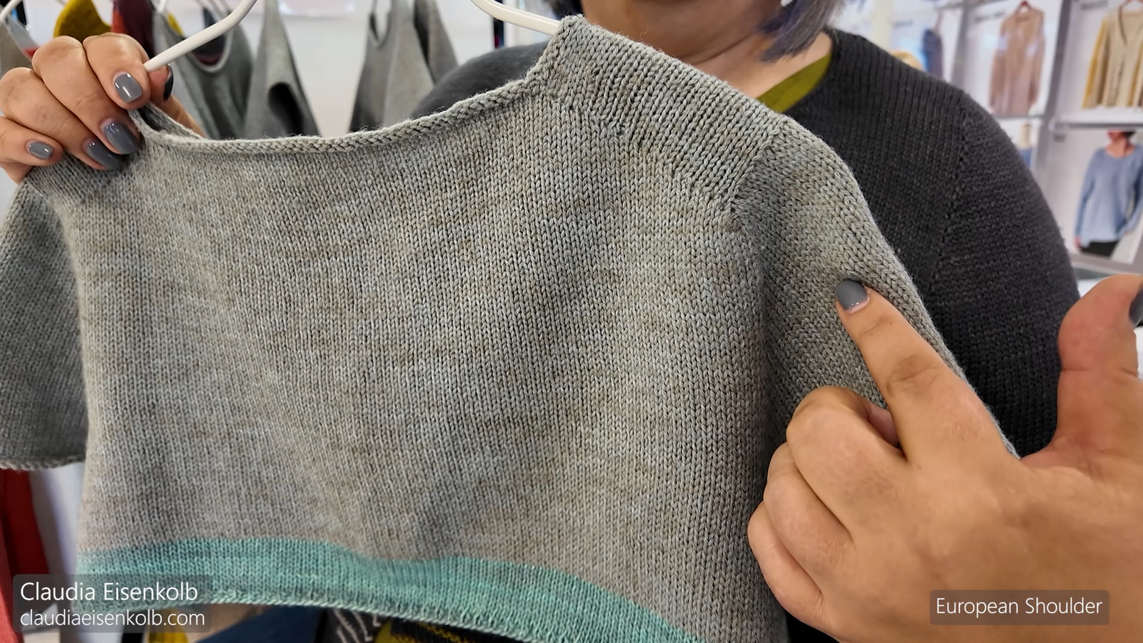 During the interview, Claudia points out which shoulder constructions suit rectangular vs. rounded shoulders better. She goes on to explain how she uses short rows and different types of waist shaping to create a cleaner fit tailored around your personal body shape.