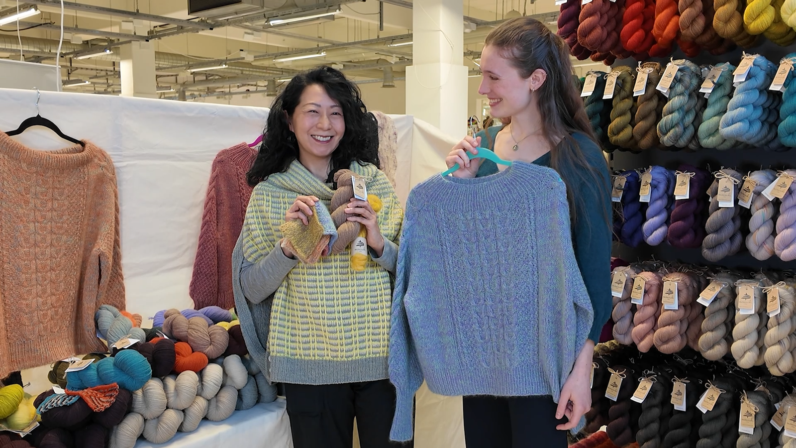 Originally from Hokkaido in Japan, Chihiro moved to Germany and eventually started Mominoki yarn, a hand-dyeing studio based in Berlin. During the interview, we talk about two of their yarn bases which are both “grown” and spun within Europe. Then, Chihiro shows off a few designs knitted up in unexpected, yet classy colour combinations.